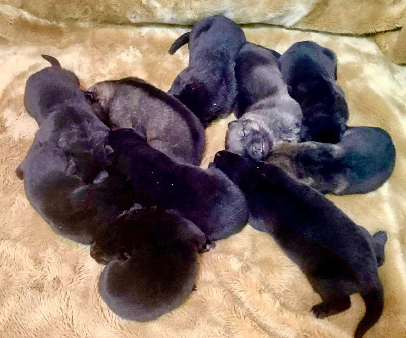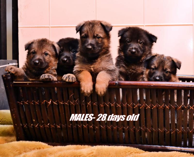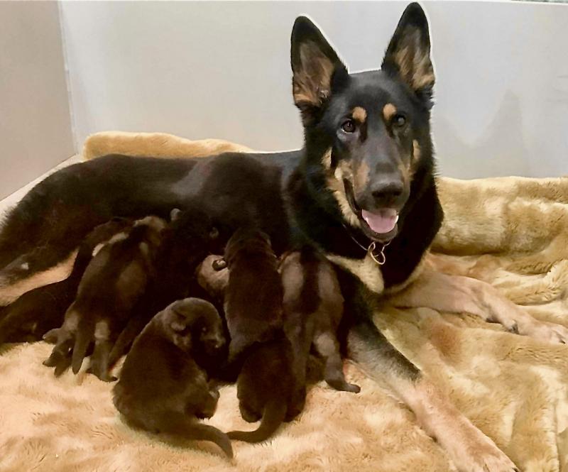 AAA-Litter was born in November of 2025. The parents are SERENA (daughter of CIRO and CYBIL) and MAX. This is a super combination for a variety of different homes. We have a big healthy litter of 10. 5 males and 5 females. Serena was an excellent mother during her first whelp and is taking her job on in a great way. She loves her pups and spends every moment tending to them as they are still young. The colours are beautiful with very strong pigment. Personality is just starting to show and we are having some fun with them now. They will be ready to go to their homes in mid January 2026. These are big puppies with large bone and are expecting them to be of a big size GSD. These last two pictures taken in the basket are on the day they turned 4 weeks old. We will be updating pictures of them in the next week or two so check back to see how they are growing.